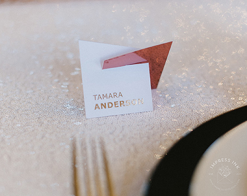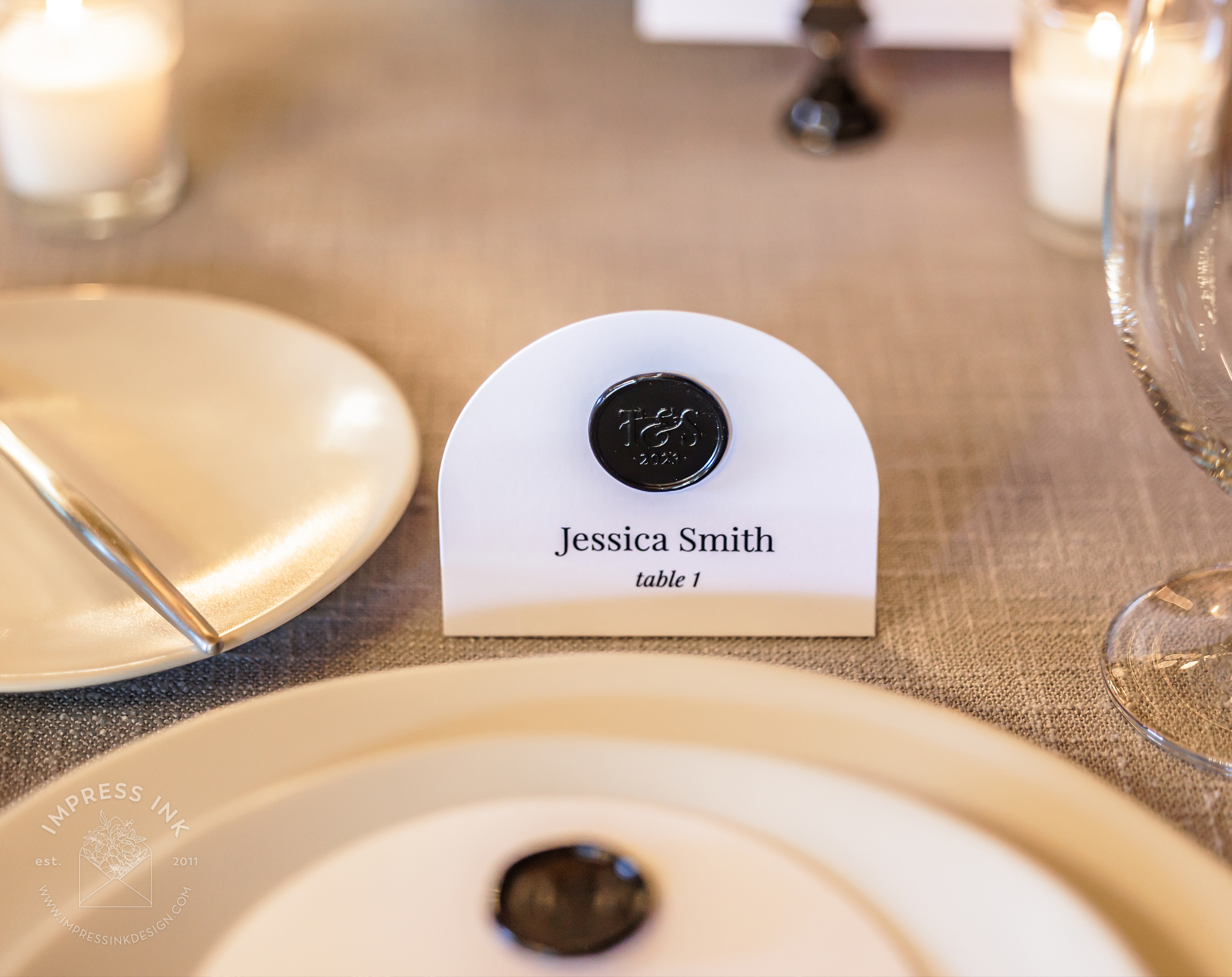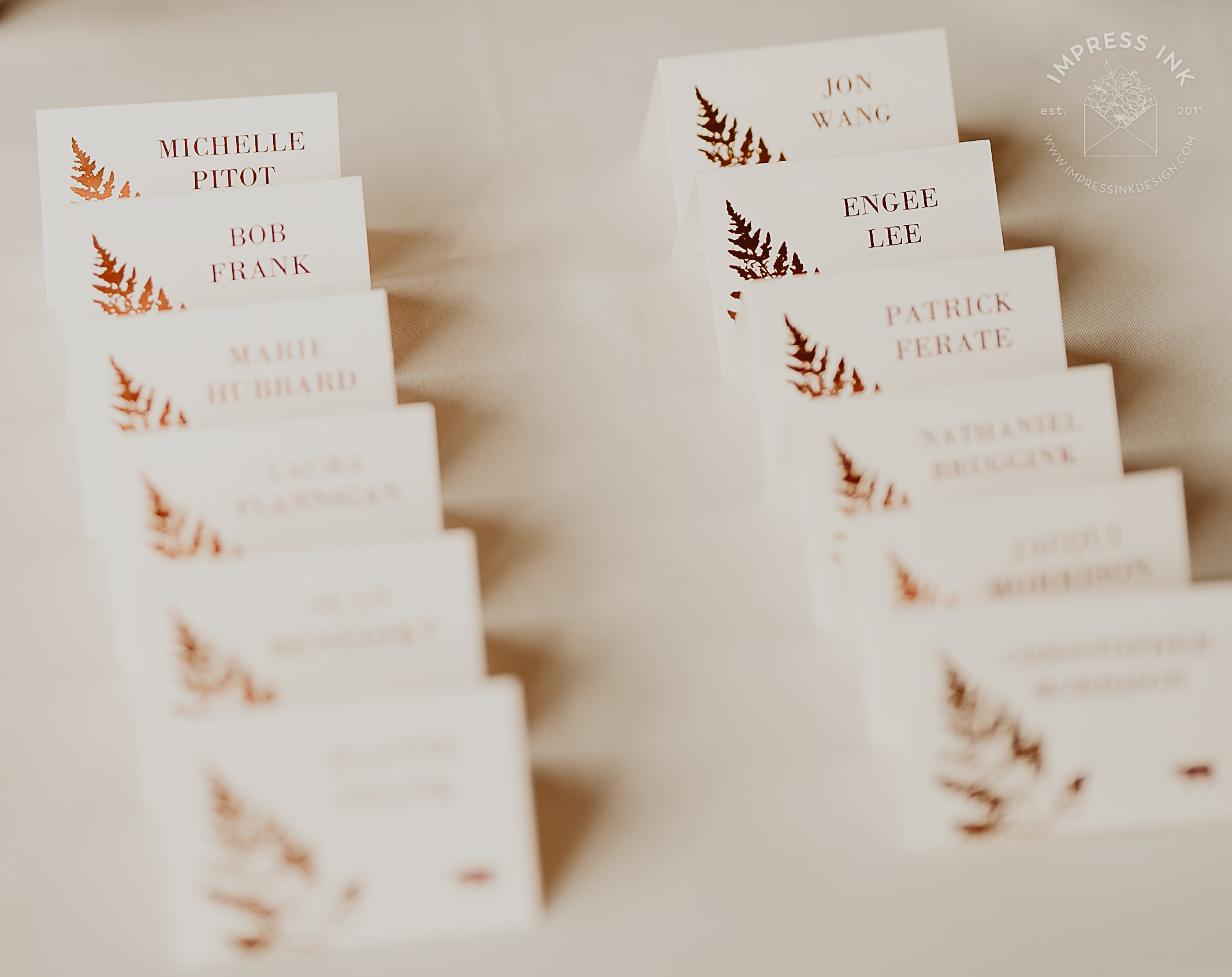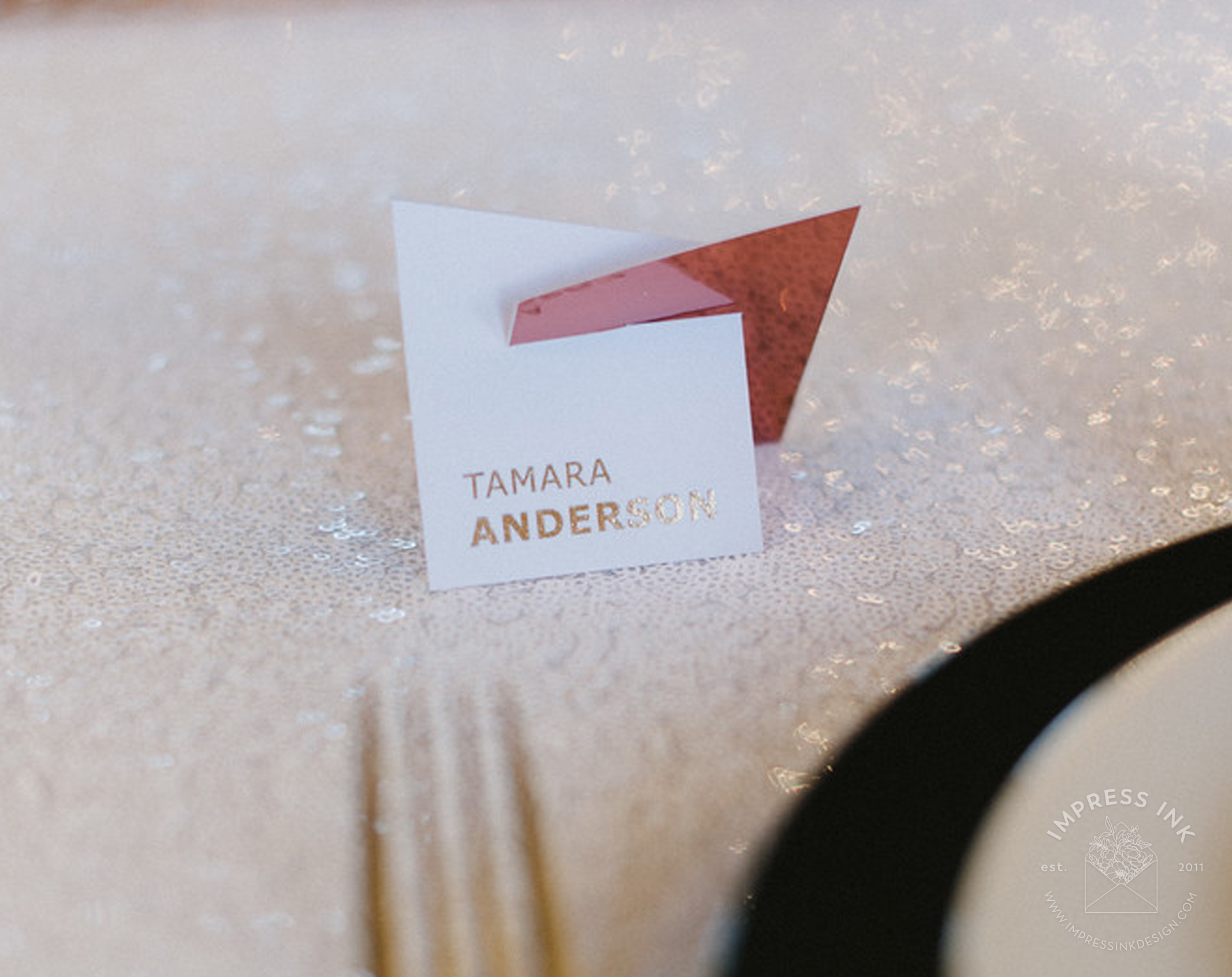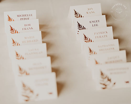Place cards are used in combination with a seating chart assign guests to their exact seat at the table. Escort Cards are used in lieu of a seating chart to assign guests to a table to choose their seat. Both come in many different styles to fit the theme and aesthetic of your event.