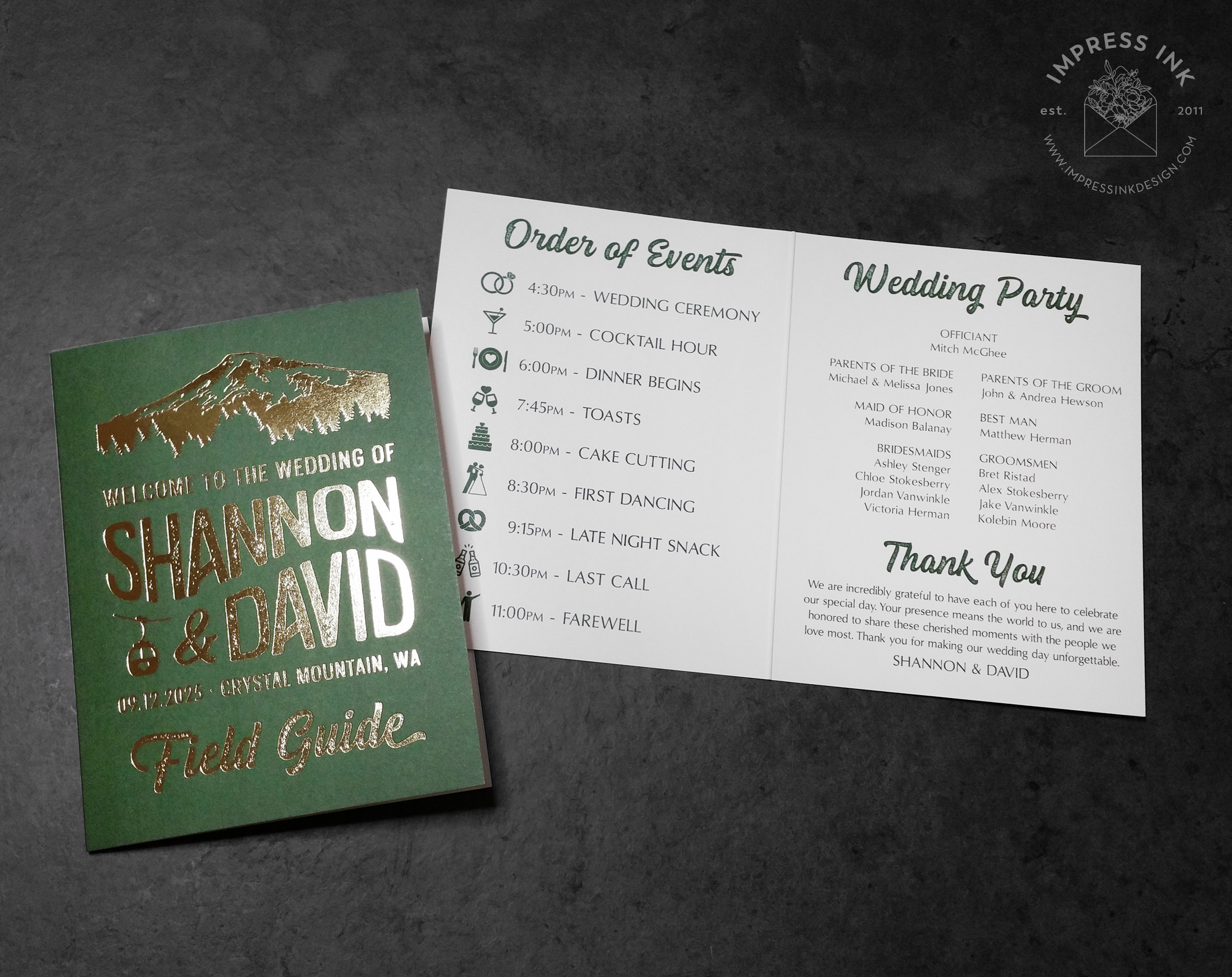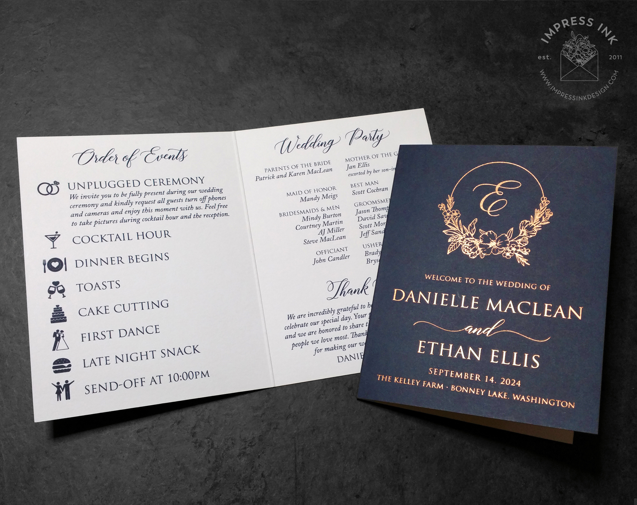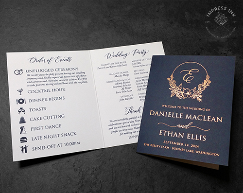 Ceremony programs inform your guests of all they need to know on your wedding day, from timeline of events to your wedding party. If you’re skipping menu cards, you can add your menu to a program booklet instead.