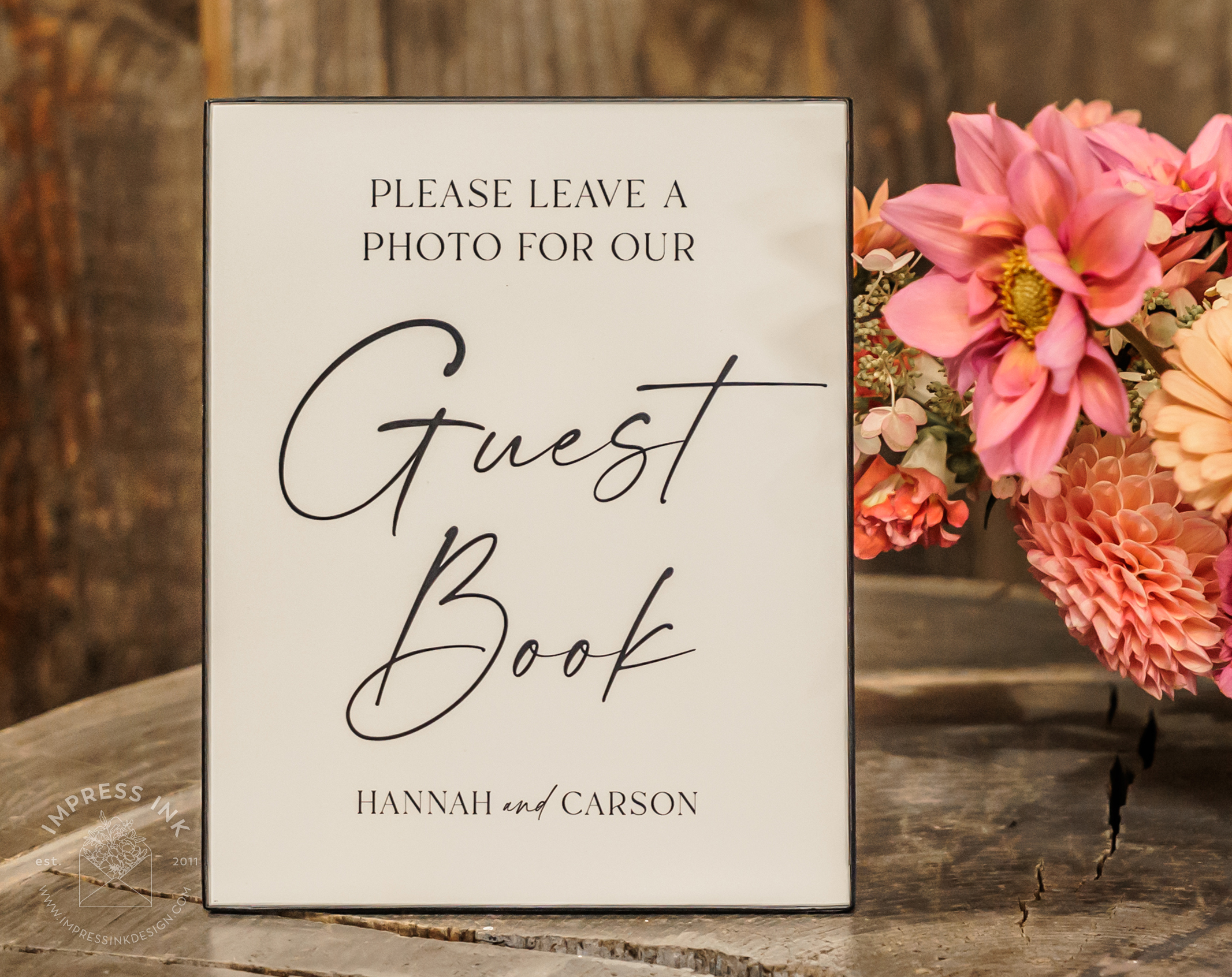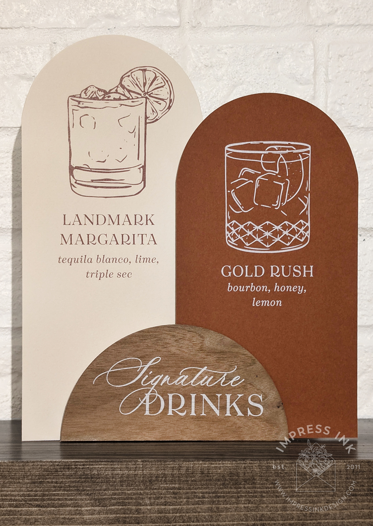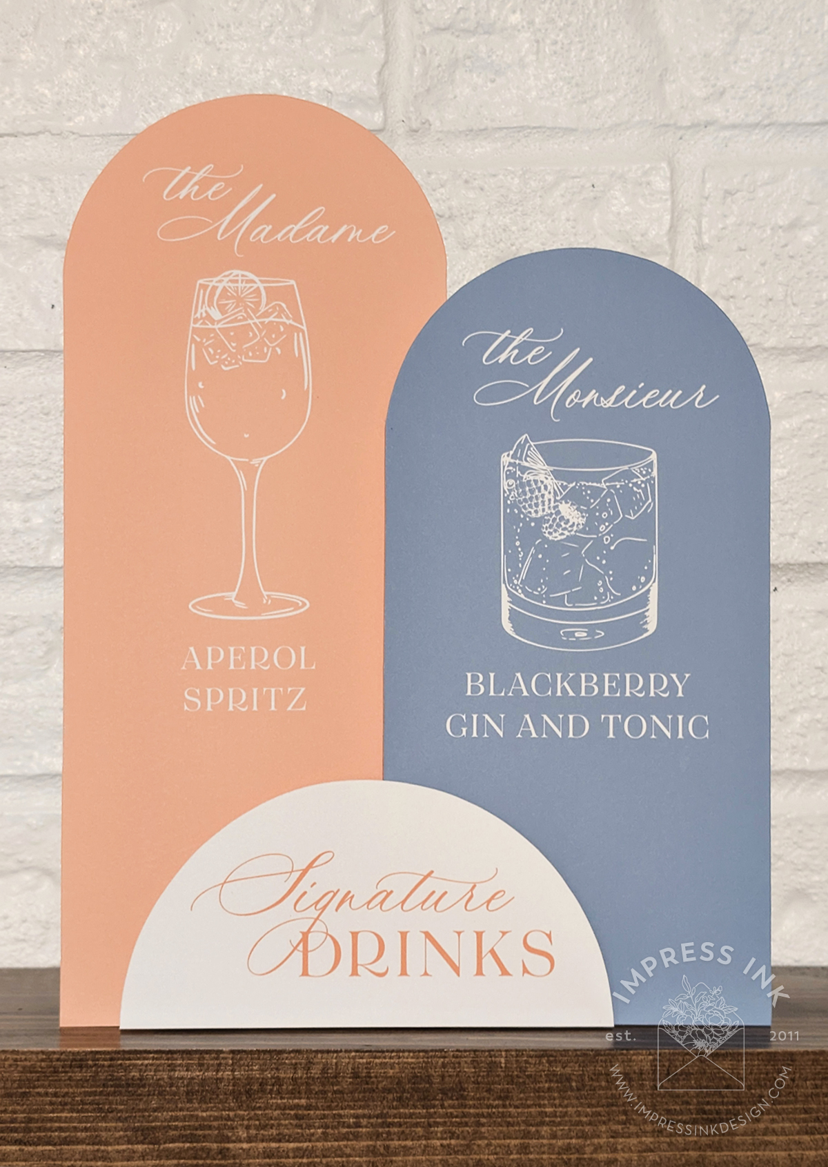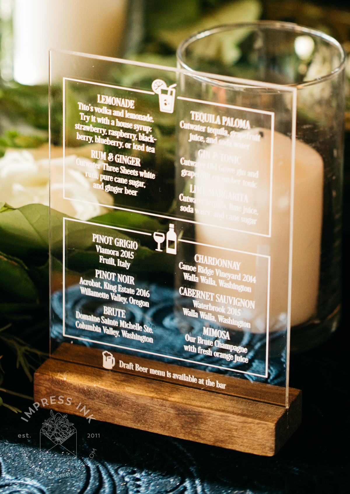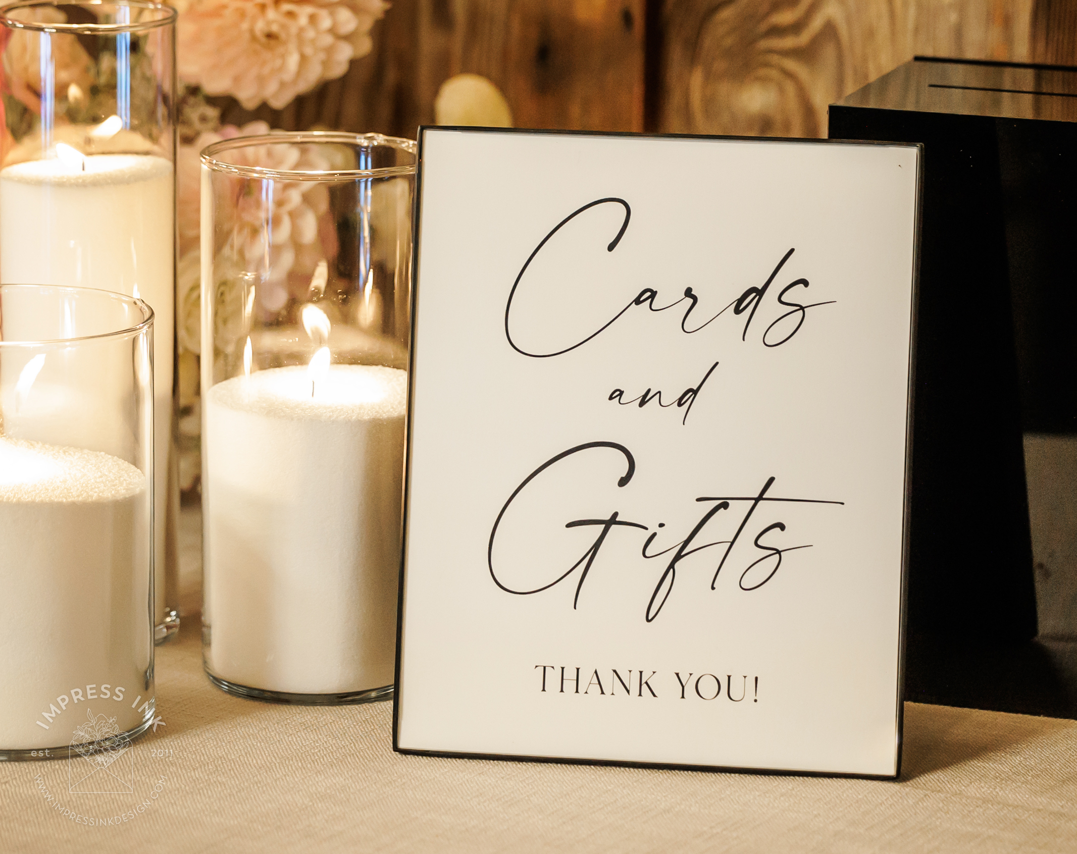 Custom table top signage help guide your guests throughout your event. Signage is completely custom and is available in many different materials and shapes, including cardstock for your frames, rigid board with easel-backs, acrylic, and wood.