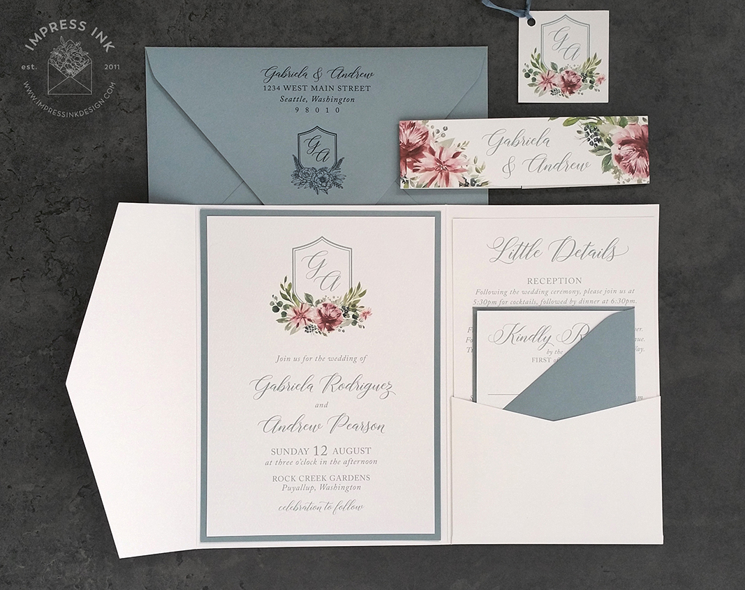 Floral Crest Pocket Invitation sample featuring a monogram in a dusty blue shield crest adorned with watercolor style flowers in dusty rose and blush pink with greenery. Invitation is mounted to a floral patterned backing layer inside of a Dusty Blue pocket folder. Matching details cards and reply cards fill the pocket while a printed band holds the whole set together. Printed envelopes complete the set.