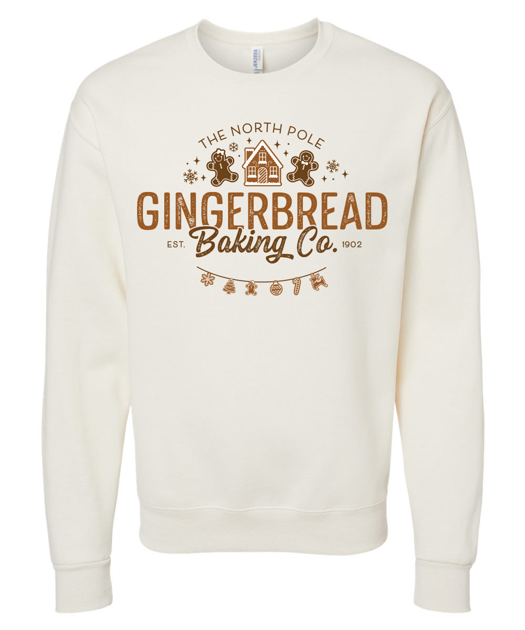 Unisex Gingerbread Crewneck Sweatshirt featuring a festive Christmas holiday graphic in rust, brown, and white on a cozy sweet cream heather crewneck sweatshirt.