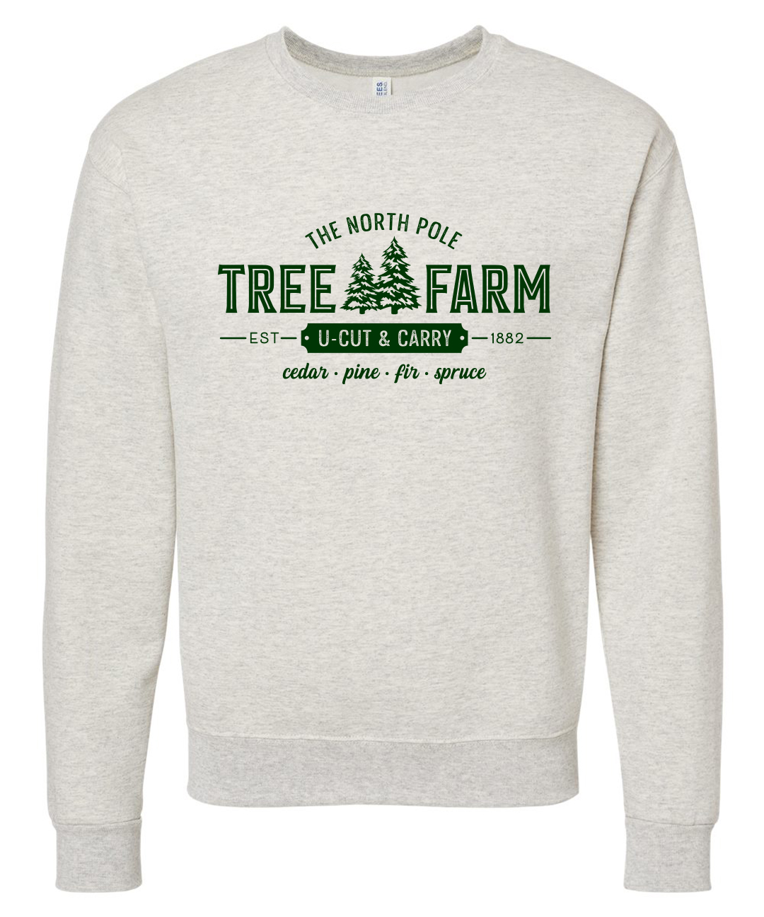 Unisex Tree Farm Crewneck Sweatshirt featuring a festive Christmas holiday graphic in forest green on a cozy oatmeal heather crewneck sweatshirt.