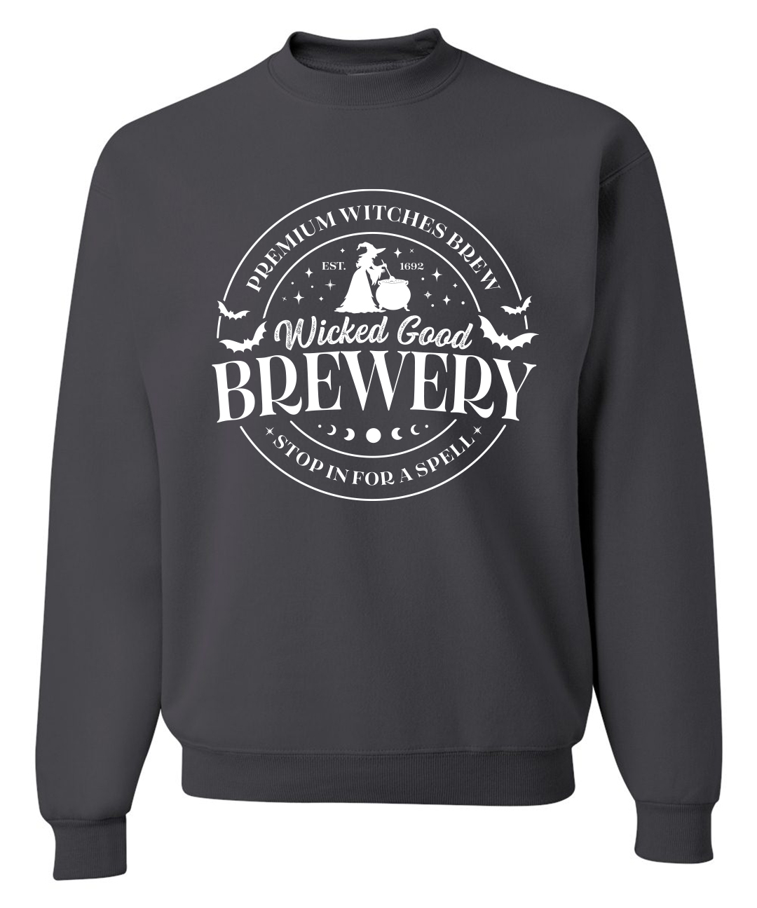 Unisex Wicked Brewery Crewneck Sweatshirt featuring a haunted Halloween graphic in white on a cozy charcoal gray crewneck sweatshirt.