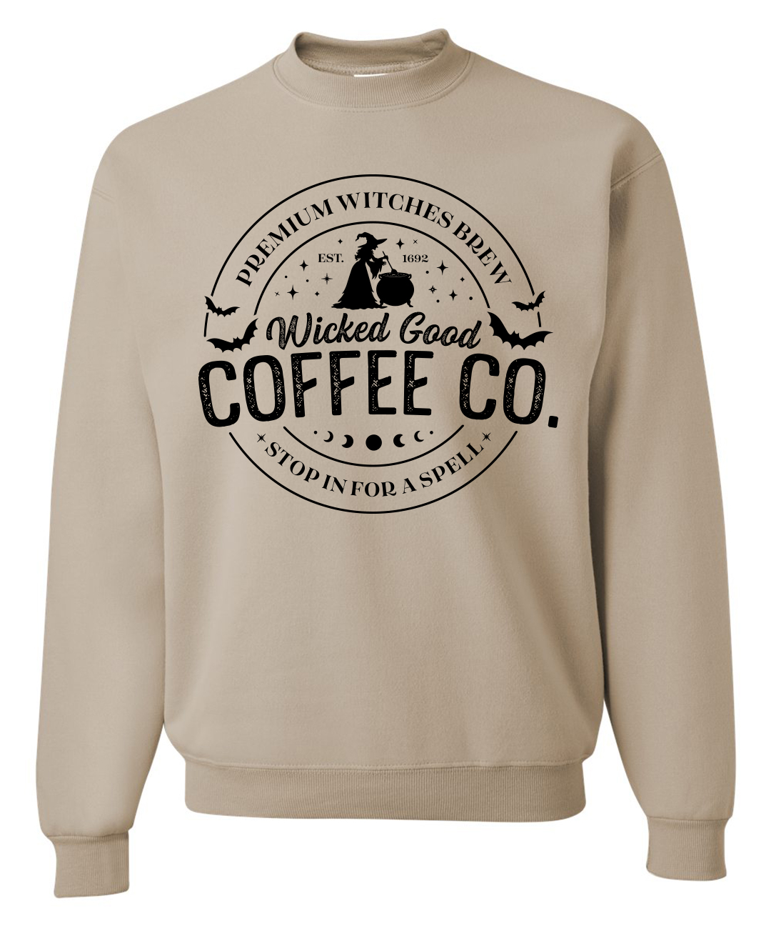 Unisex Wicked Coffee Crewneck Sweatshirt featuring a haunted Halloween graphic in black on a cozy sandstone beige crewneck sweatshirt.
